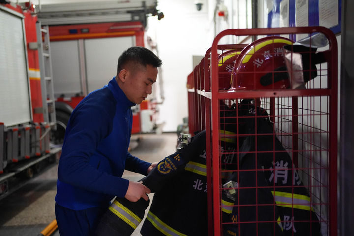 2月3日,一名消防员对消防防护装备进行检查。新华每日电讯记者谢晗 摄