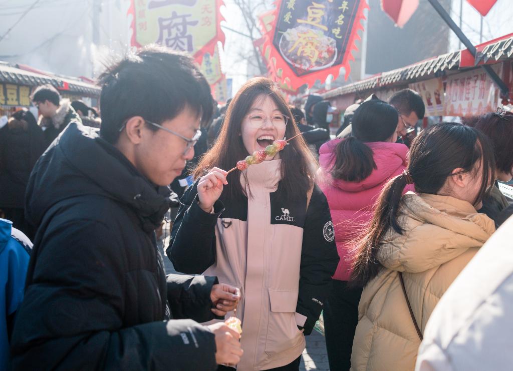 在北京市昌平区沙河大集,一名女孩在品尝特色小吃(2月8日摄)。