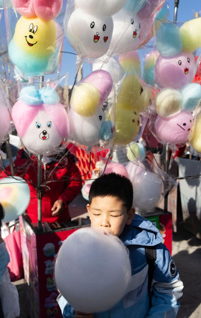 在北京市昌平区沙河大集,一名儿童在吃棉花糖(2月8日摄)。