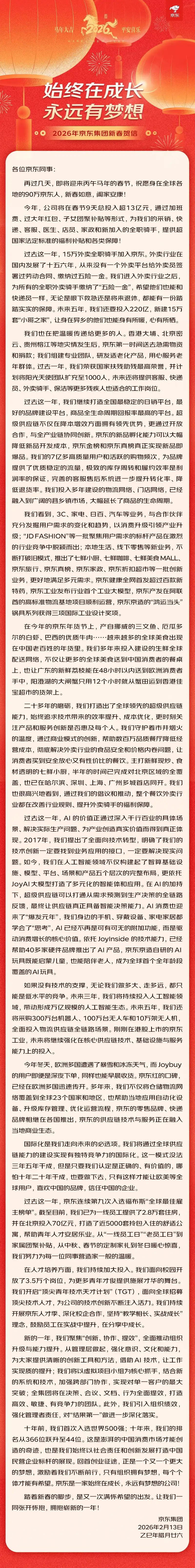 京东集团发布2026年新春贺信:始终在成长,永远有梦想