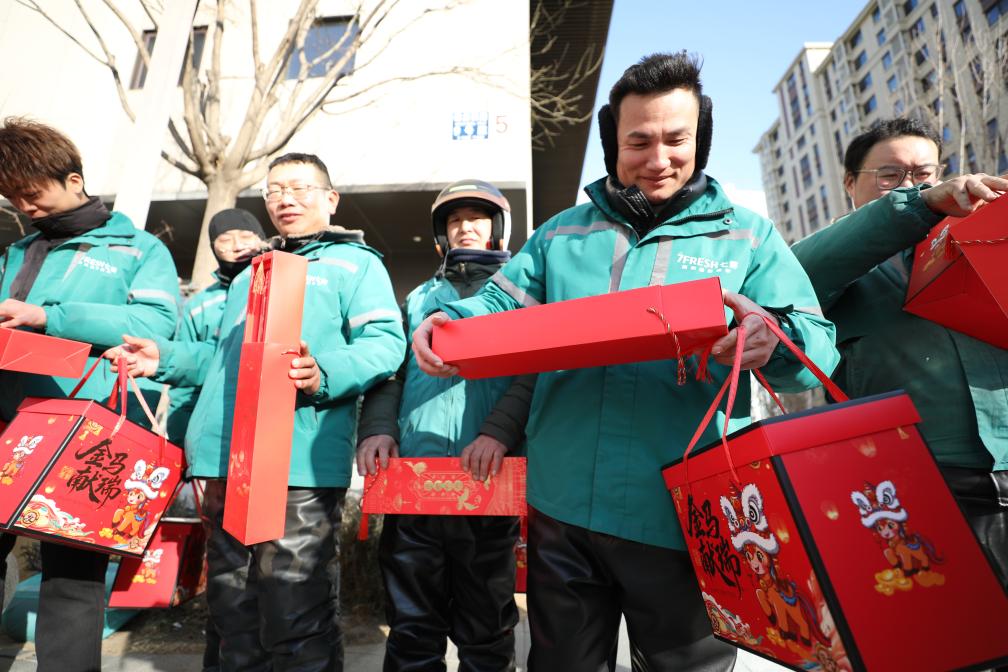 丰台区南苑街道辖区内的快递小哥们收到了春节礼物。(受访单位供图)