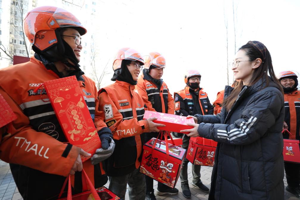 丰台区南苑街道党群服务中心的工作人员为快递小哥送上春节礼物。(受访单位供图)