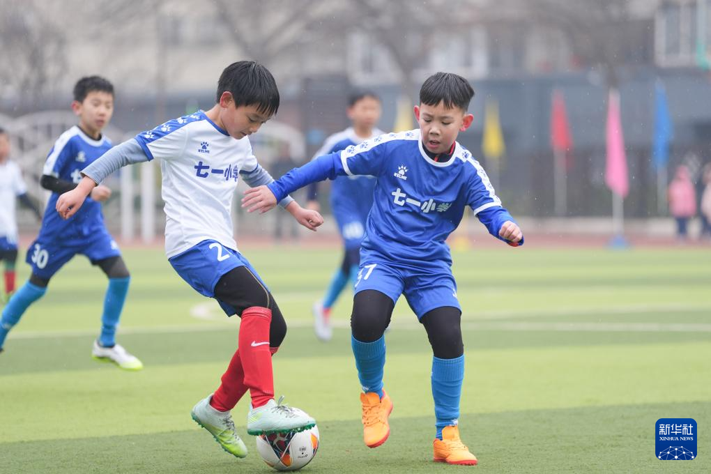 3月2日,北京市海淀区七一小学学生在“浪花杯”班级足球联赛中拼抢。