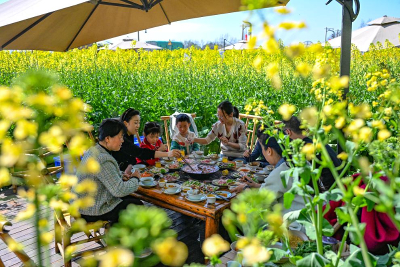 在成都新津区天府农业博览园,“美食+美景”的春日盛宴正在花田间上演。火锅错落于油菜花海,游客围坐其间,在一片片清甜花香中,大快朵颐。麻辣鲜香在舌尖绽放,满目金黄在眼底流淌——花田火锅,就这样烹出了独属于春天的浪漫烟火气。