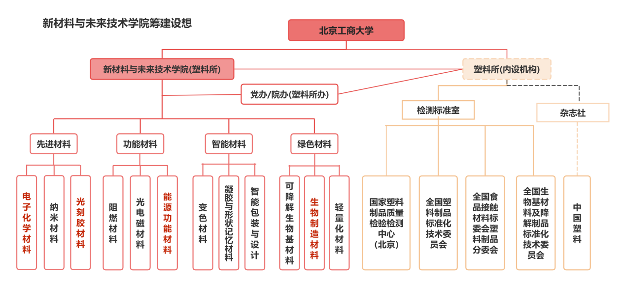 北京工商大学新材料与未来技术学院与原轻工业塑料加工应用研究所(塑料所)合署办公,统一管理《中国塑料》杂志社,构建“科研创新—检测标准—行业出版—成果转化”全链条平台。学院依托材料科学与工程、化学工程与技术两个一级学科,设置先进材料、功能材料、智能材料、绿色材料四个系,覆盖本硕博完整培养体系。