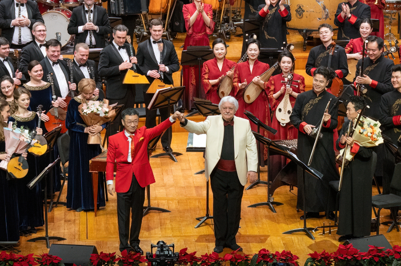 音乐会的高潮与灵魂,在下半场的“和鸣”中精彩绽放,并由中国音乐学院院长、著名指挥家李心草与俄罗斯人民艺术家、俄罗斯奥西波夫国立模范民乐团艺术总监弗拉基米尔·安德罗波夫执棒。曲目围绕“对话”与“共鸣”展开,两国艺术家乐音交错,带来更深层次的民乐融合:《礼尚·乐合》由中国乐曲《礼尚·乐合》与俄罗斯乐曲《欢迎序曲》编创而成,两国乐团以完整联合编制的形式奏响,宏大的音响瞬间确立了“和”的基调。随后,俄罗斯巴扬演奏家丹尼尔·斯塔德纽克与联合乐团合作的《草地上的小鸭子》,展现了巴扬灵动的非凡表现力;而中央民族乐团二胡演奏家李超带来的《良宵》,在中俄民族乐器的和声衬托下,更添一份温暖深邃的意蕴。