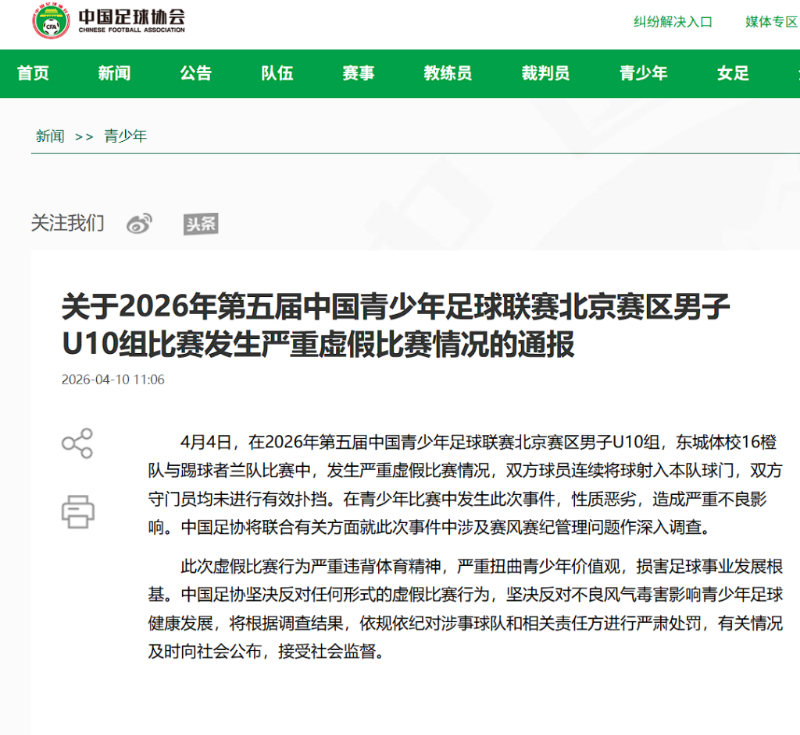 新华社北京4月10日电(记者肖世尧、王浩宇、李春宇)近日,2026年第五届中国青少年足球联赛北京赛区男子U10组爆出严重虚假比赛事件。通报显示,东城体校16橙队与踢球者兰队在比赛中心照不宣互射乌龙,门将故意放水,行径荒唐。