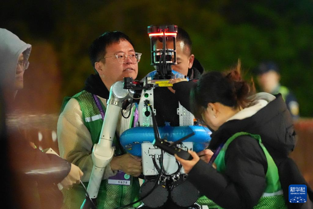 4月11日,工作人员在测试活动中为一台机器人更换电池。