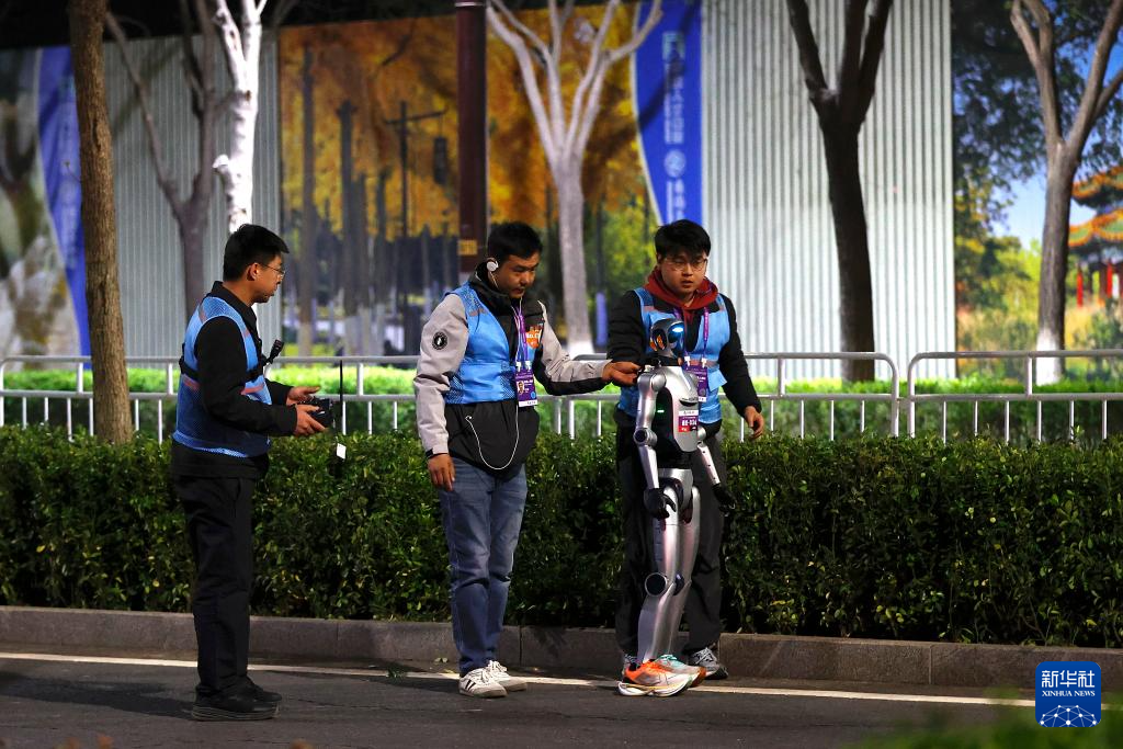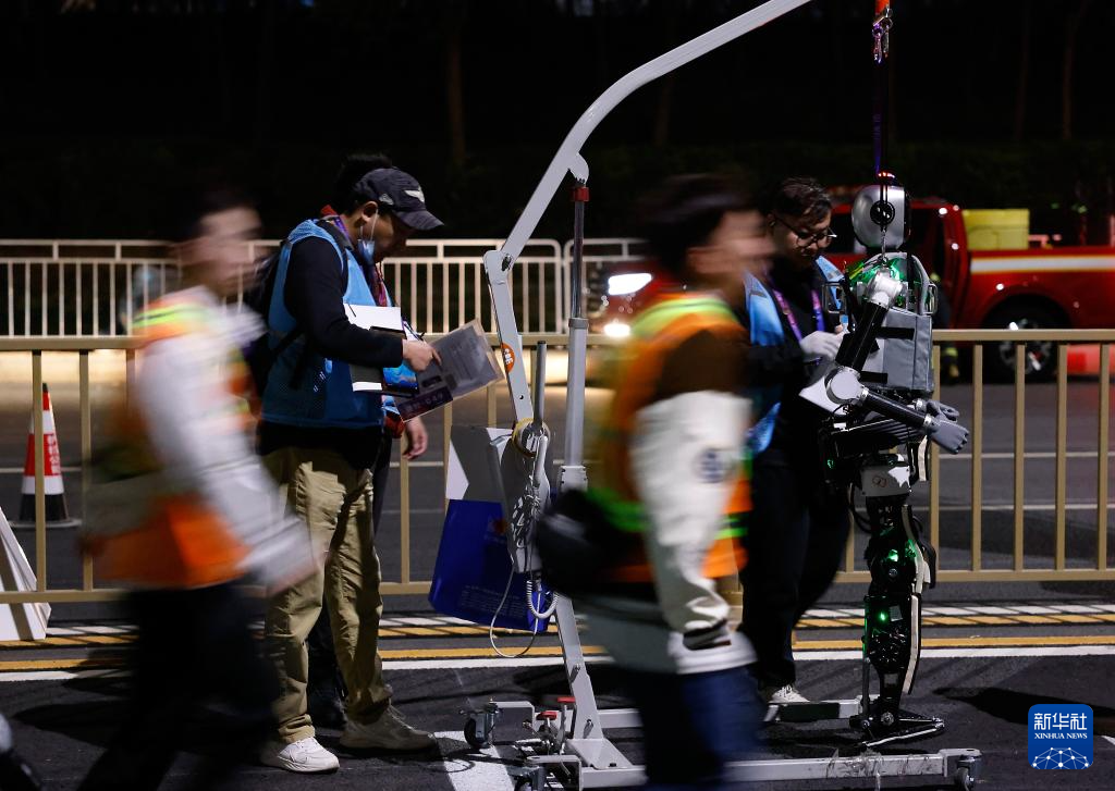 4月12日凌晨,操作人员在调试一台参加全要素测试的机器人。新华社发(翟一凡摄)