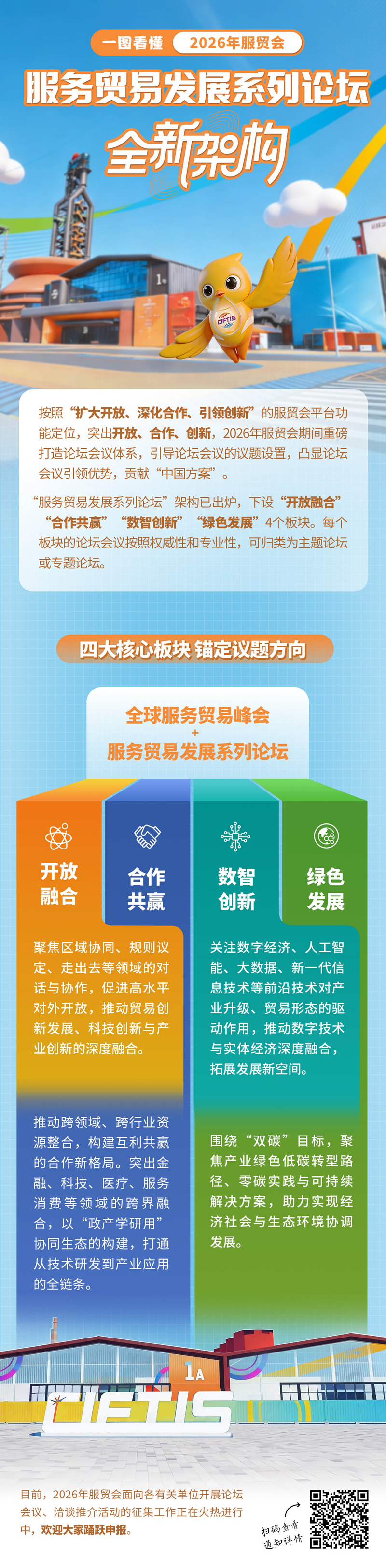 目前,“服务贸易发展系列论坛”架构已确定,将设“开放融合”“合作共赢”“数智创新”“绿色发展”4个板块。每个板块的论坛会议按照权威性和专业性,分设主题论坛与专题论坛,聚焦行业关键议题展开深度研讨。