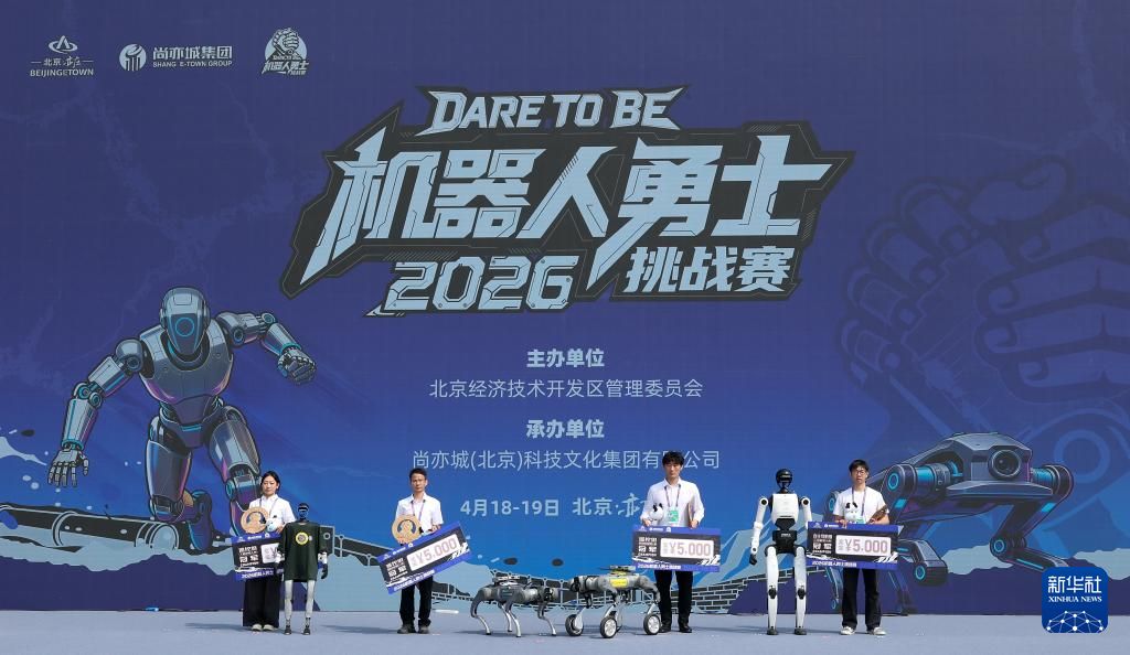 4月19日,人形机器人半程马拉松冠军齐天大圣队自主选手闪电(中)、亚军雷霆闪电队自主选手闪电(左二)和季军星火燎原队自主选手闪电(右一)在颁奖仪式上。
