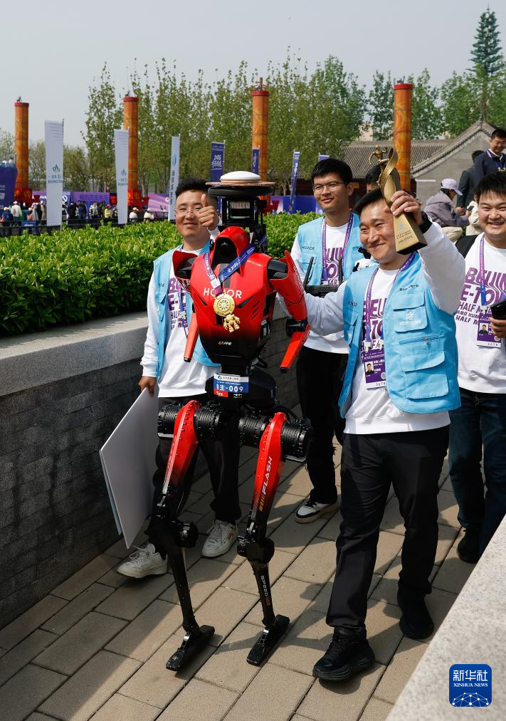 4月19日,人形机器人半程马拉松冠军齐天大圣队自主选手闪电(前中)在颁奖仪式后。