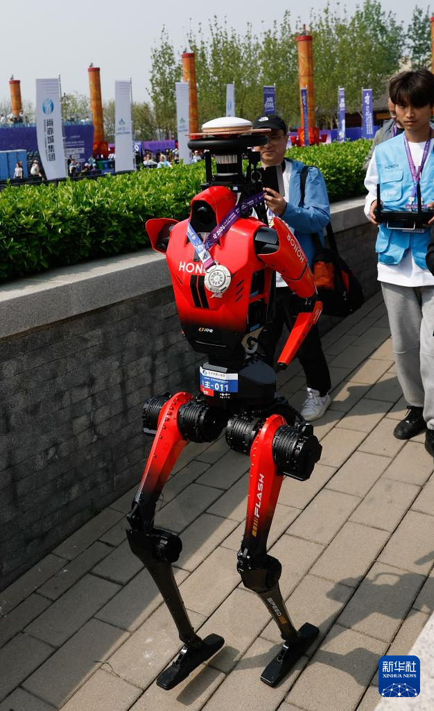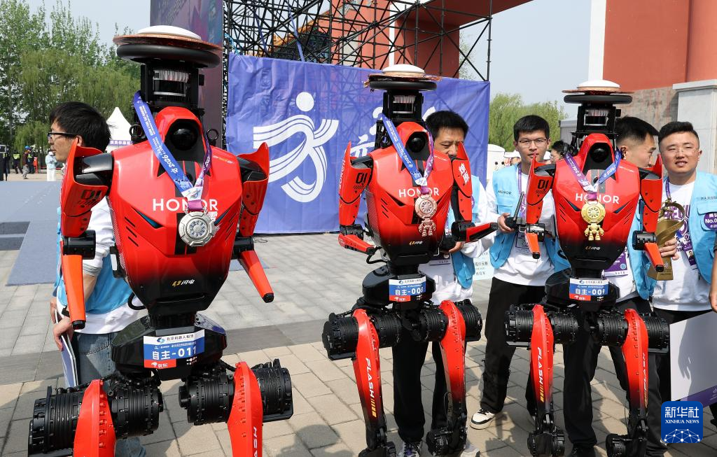 4月19日,人形机器人半程马拉松亚军雷霆闪电队自主选手闪电(前)在颁奖仪式后。