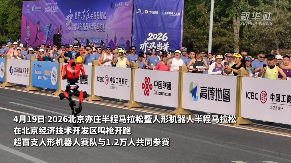 4月19日,2026北京亦庄半程马拉松暨人形机器人半程马拉松在北京经济技术开发区鸣枪开跑。超百支人形机器人赛队与1.2万人共同参赛。