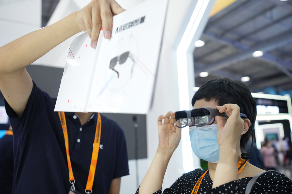9月1日,在服贸会首钢园展区电信、计算机和信息服务专题展馆,参观者体验一款增强现实(AR)眼镜产品。新华社记者 鞠焕宗 摄