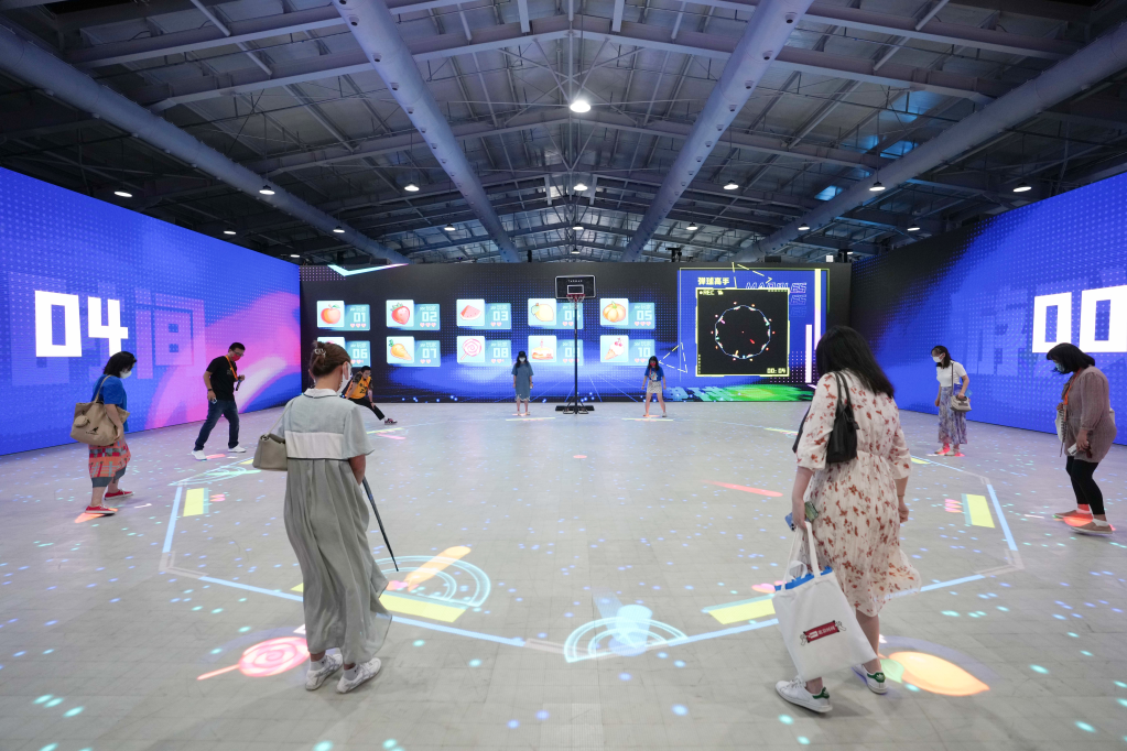 9月1日,在服贸会首钢园区,参观者在元宇宙体验展馆内体验一款互动游戏。新华社记者 鞠焕宗 摄