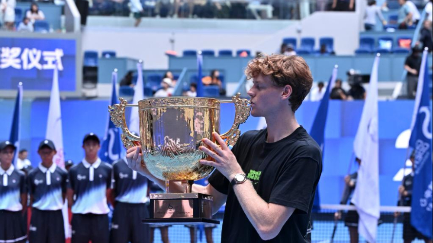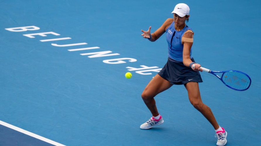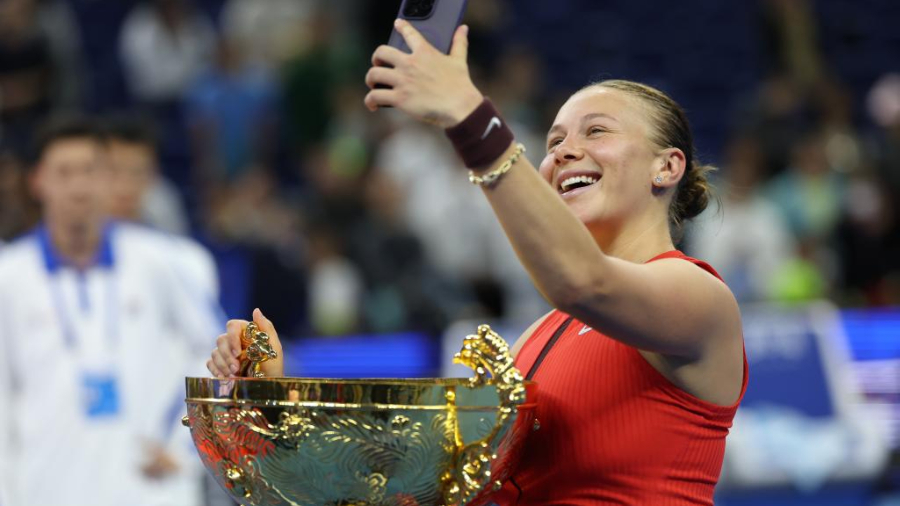 10月5日,阿尼西莫娃在颁奖仪式上自拍。当日,在北京举行的2025中国网球公开赛女子单打决赛中,美国选手阿尼西莫娃2比1战胜捷克选手诺斯科娃,获得冠军。
