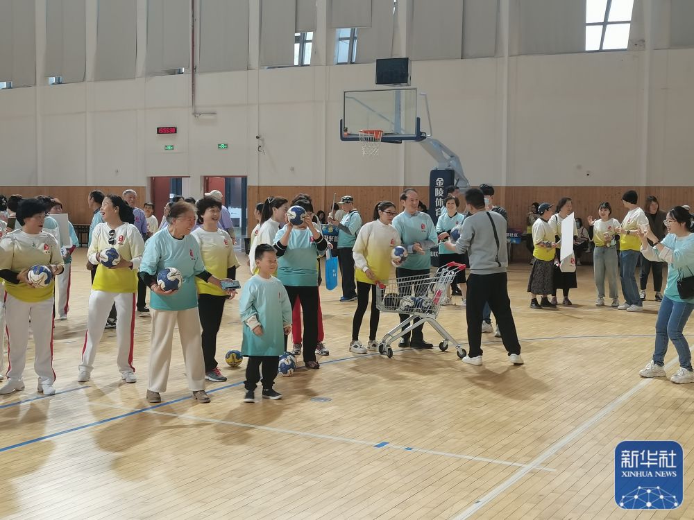 ↑杭州白杨街道居民在浙江工商大学文体中心体验手球。浙江工商大学文体中心为杭州亚运会手球项目比赛场馆(杭州亚组委供图)。