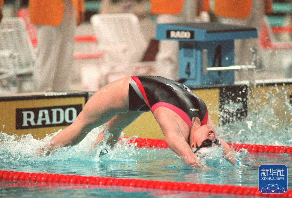 ↑中国选手林莉在北京亚运会女子200米仰泳比赛中(1990年9月28日摄)。