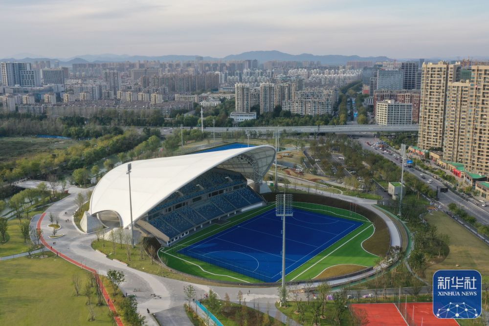 ↑拱墅运河体育公园体育场(2021年11月9日摄)。杭州亚运会期间这里是曲棍球项目的比赛场地。