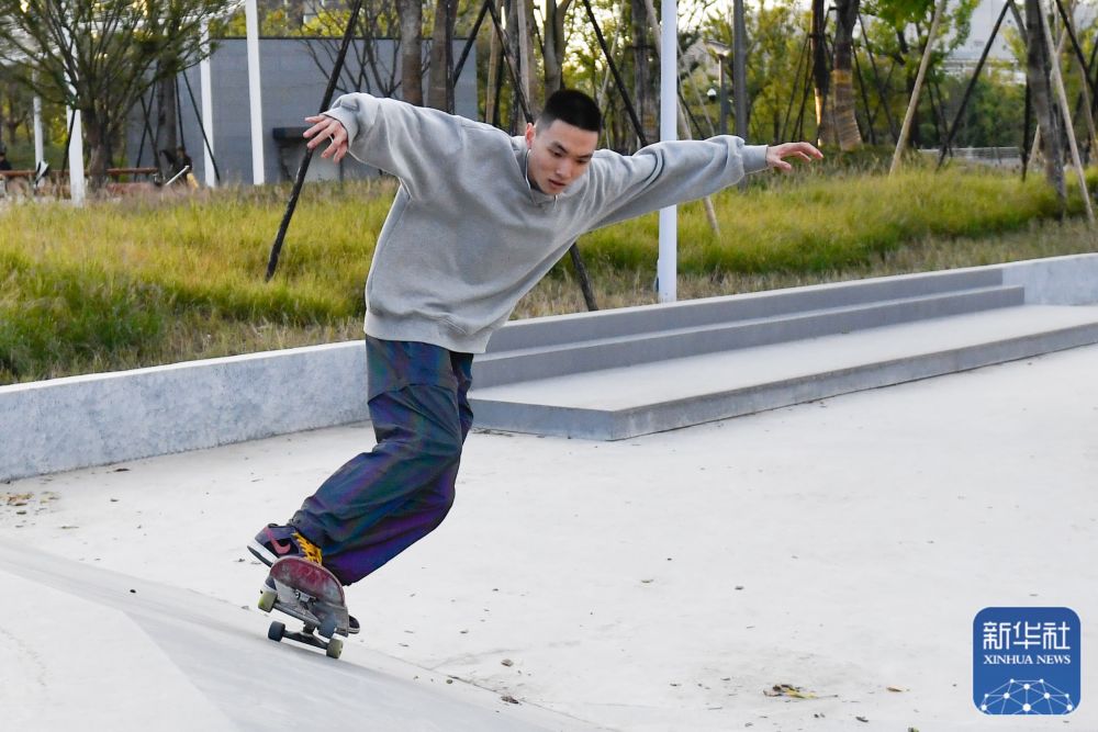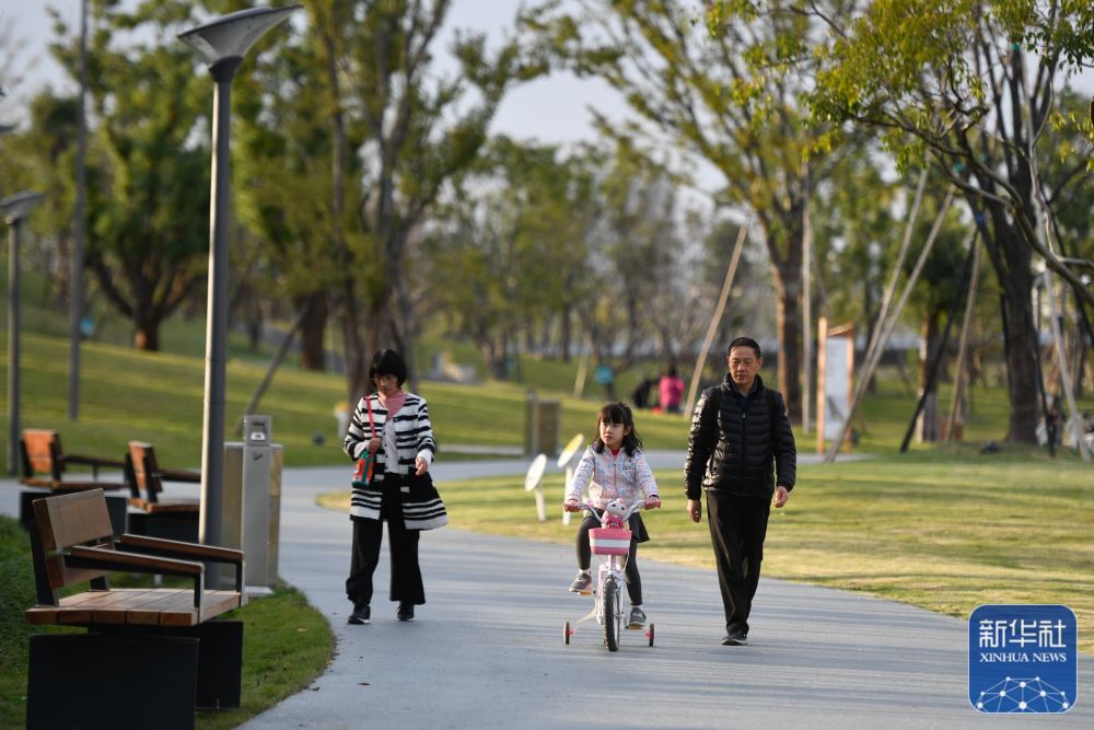 ↑小朋友在拱墅运河体育公园里骑行(2021年11月9日摄)。