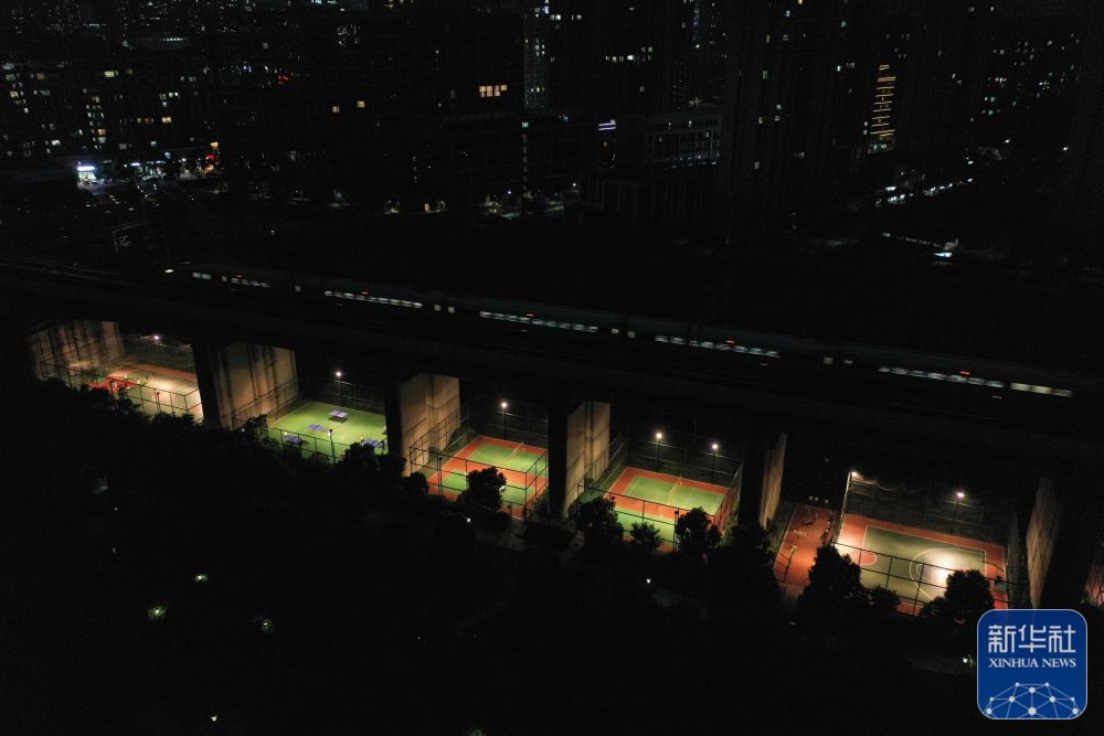 ↑市民在位于高铁桥下的钱江世纪城体育公园打篮球(2022年9月20日摄)。