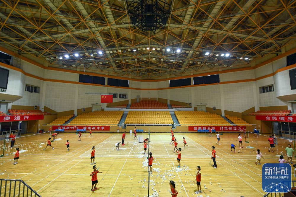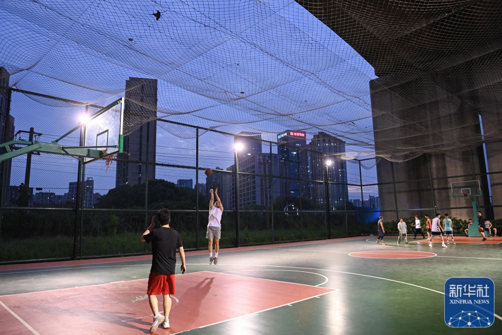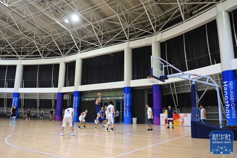 ↑市民在黄龙体育中心体育馆打篮球(2023年8月21日摄)。这里将承办杭州亚运会体操项目比赛。