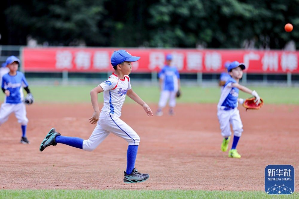 ↑小朋友在天河棒垒球场练习棒球(2023年8月22日摄)。这里曾是广州亚运会棒垒球比赛场地。