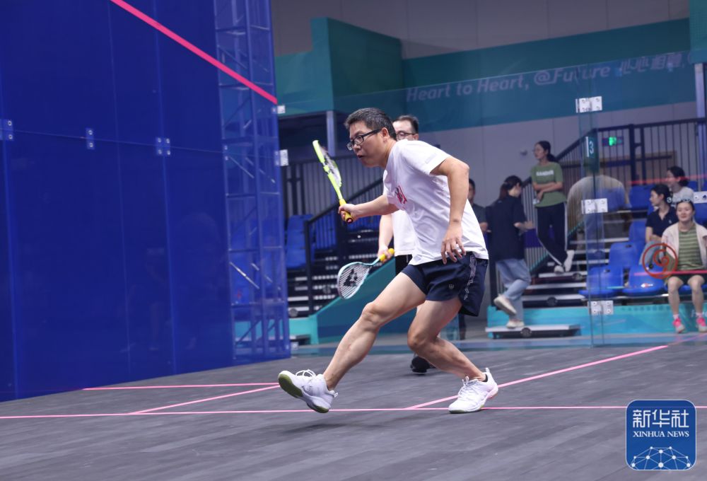 ↑市民在在杭州奥体中心国博壁球馆打壁球(2023年9月4日摄)。这里是杭州亚运会壁球项目的比赛场馆。