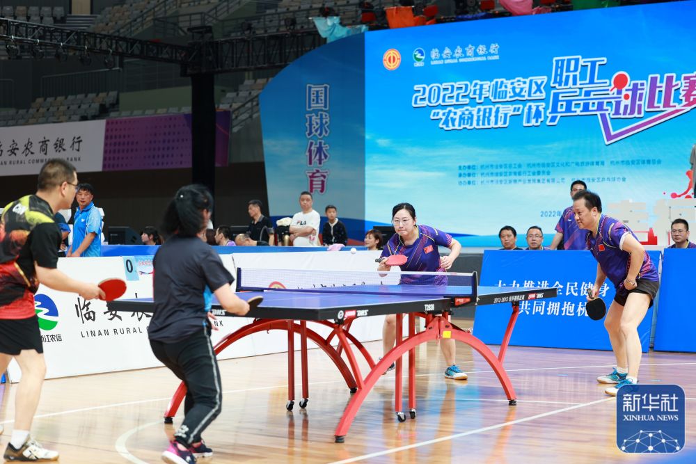 ↑在临安体育文化会展中心体育馆,参赛选手参加2022年临安区职工乒乓球比赛(2022年5月18日摄)。临安体育文化会展中心体育馆为亚运会跆拳道、摔跤项目比赛场馆。