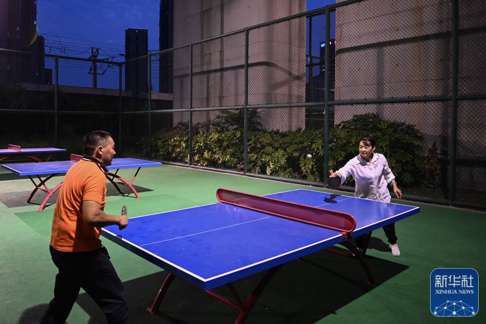 ↑市民在位于高铁桥下的钱江世纪城体育公园打乒乓球(2022年9月20日摄)。