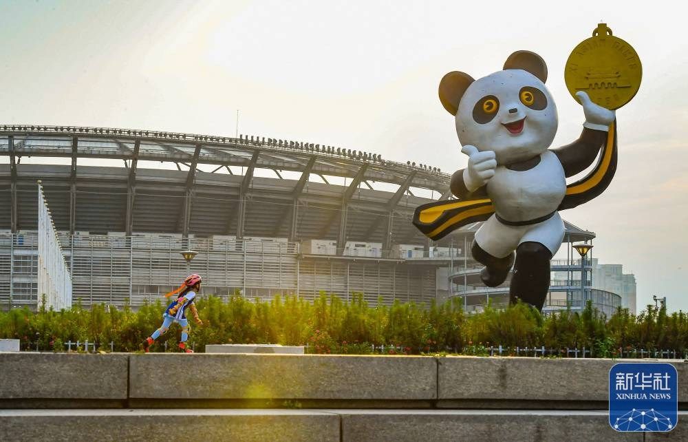 ↑一名小朋友正在北京亚运会吉祥物盼盼的雕塑旁边练习轮滑(2023年8月20日摄)。