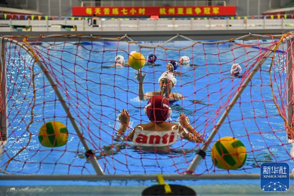 ↑小朋友们在国家奥林匹克体育中心的英东游泳馆里参加水球培训(2023年8月20日摄)。这里曾是北京亚运会游泳比赛场馆。
