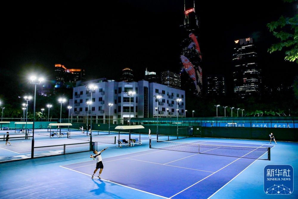 ↑网球爱好者在天河网球学校练习(2023年8月21日摄)。这里曾是广州亚运会软式网球比赛场地。