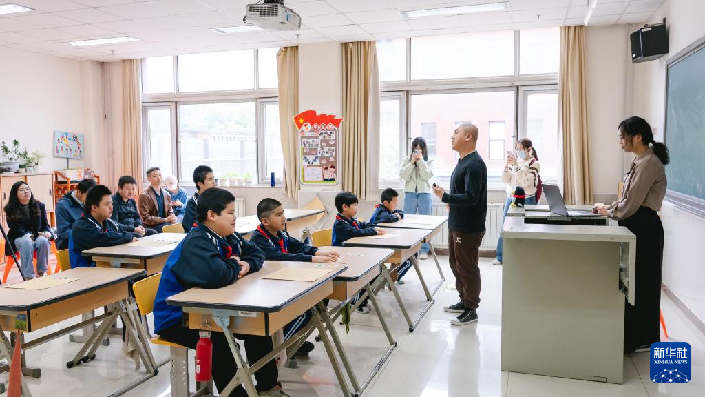 4月29日,在北京市盲人学校,盲人无障碍测评体验师王超(右三)为孩子上课。