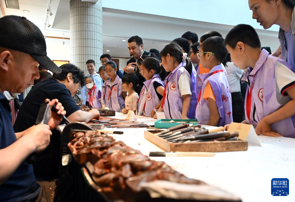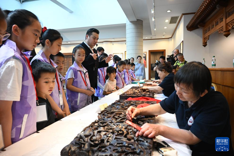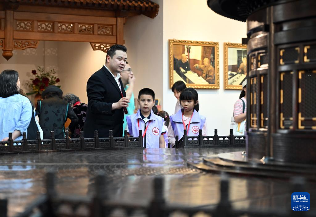 5月18日,“小小讲解员”在紫檀博物馆工作人员带领下参观国家级非遗项目“紫檀雕刻”。