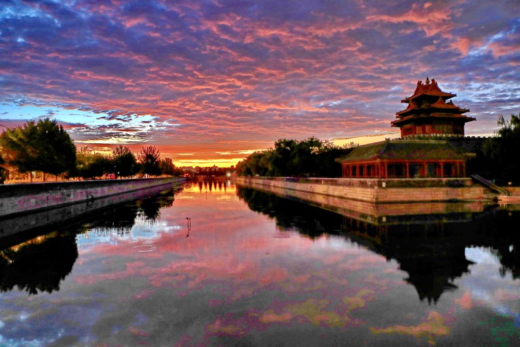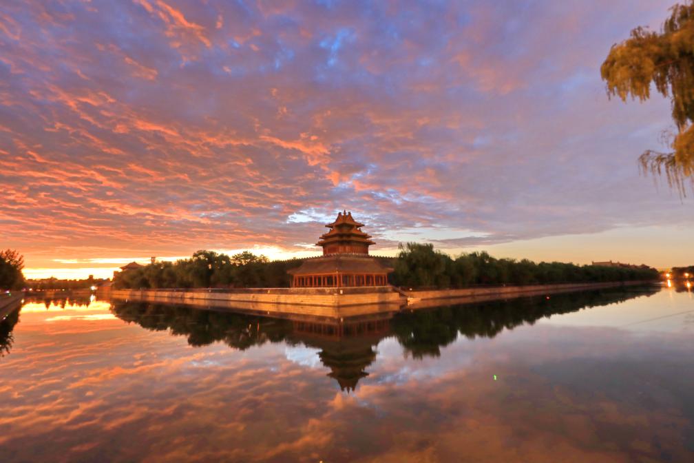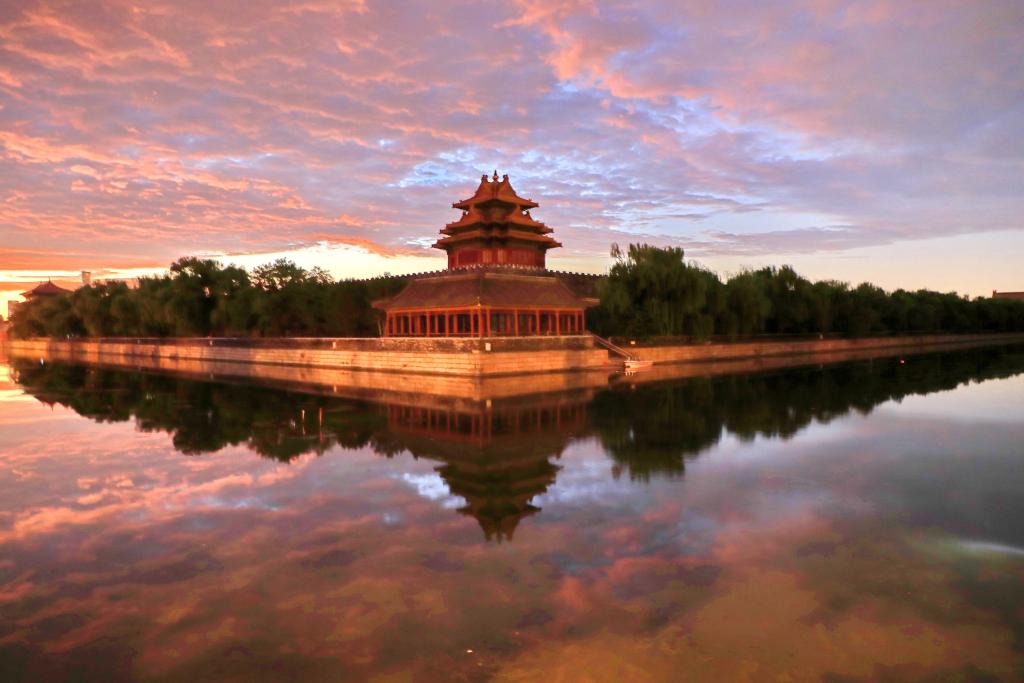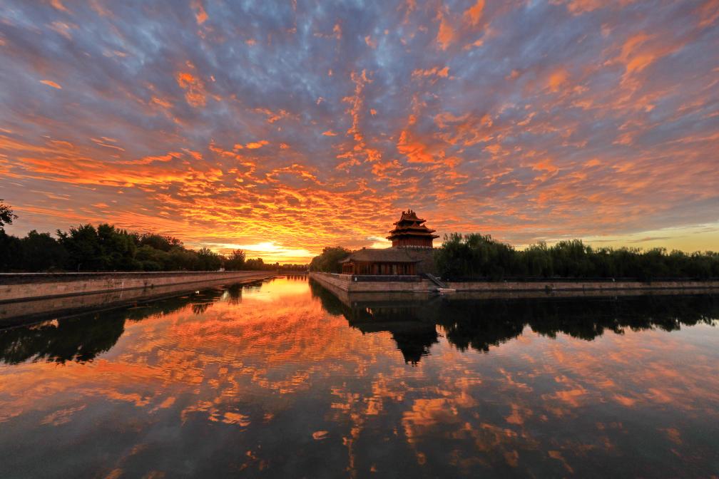 2024年9月6日,北京,朝霞映照故宫角楼,天空被晕染成橙色,云彩、护城河、角楼相映成趣,美不胜收。