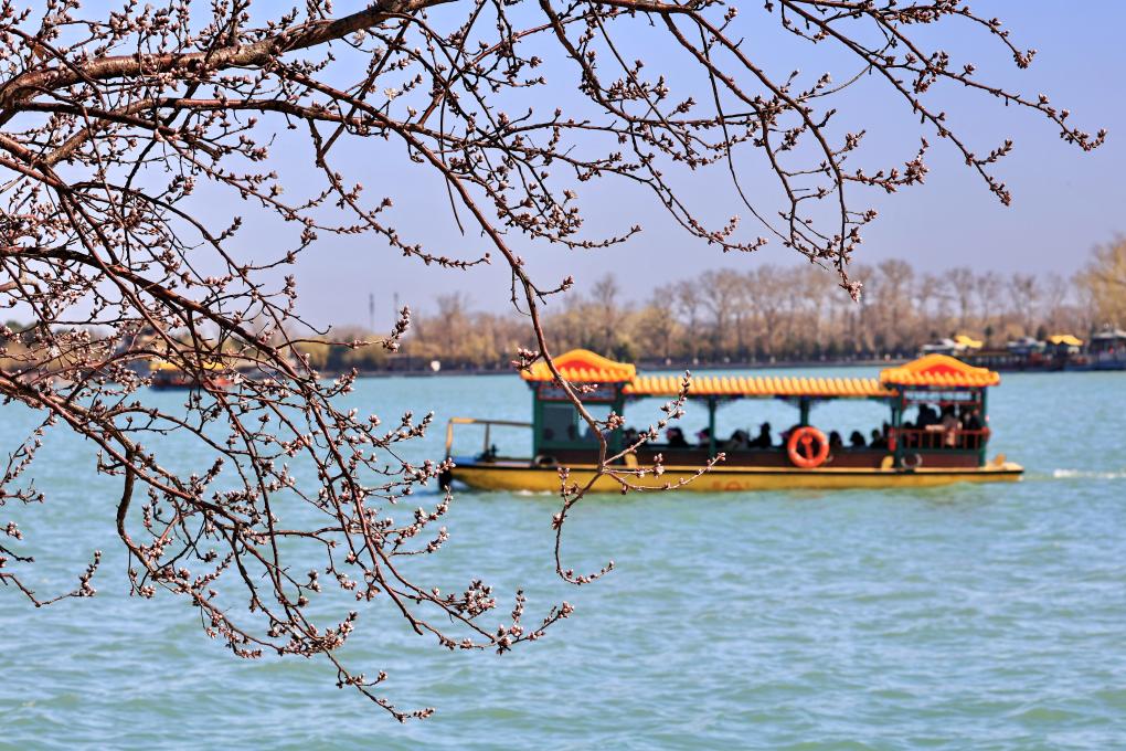↑2025年3月12日,北京颐和园西堤桃花绽放,游人乘船赏花游玩。CICPHOTO/刘宪国 摄