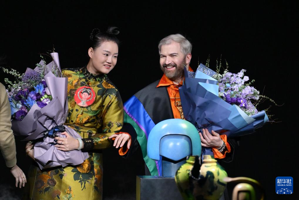 3月24日,在北京王府中心举行的2025秋冬北京时装周闭幕秀上,法国籍的独立设计师伊拉克利·纳西泽(右)向观众致意。