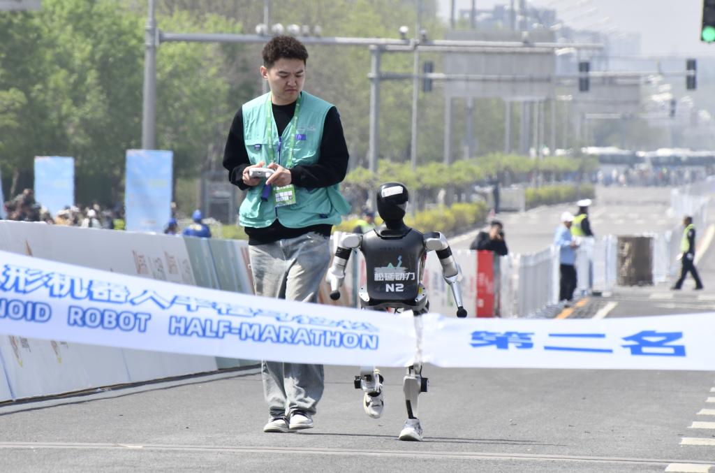 4月19日,小顽童队选手松延动力N2在比赛中。新华社记者 李贺 摄