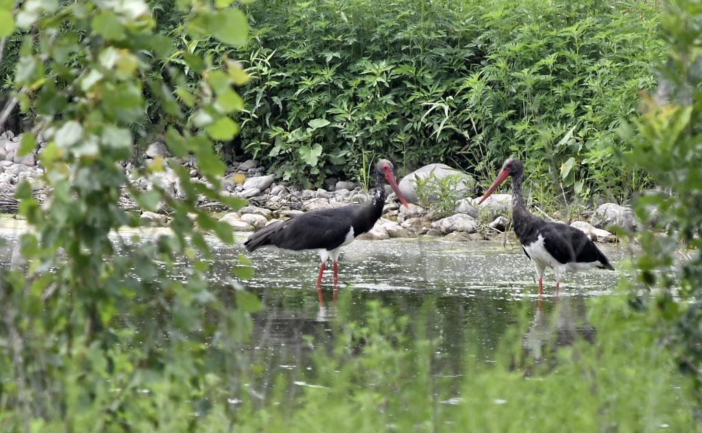 黑鹳在密云水库流域的河道内觅食(7月8日摄)。