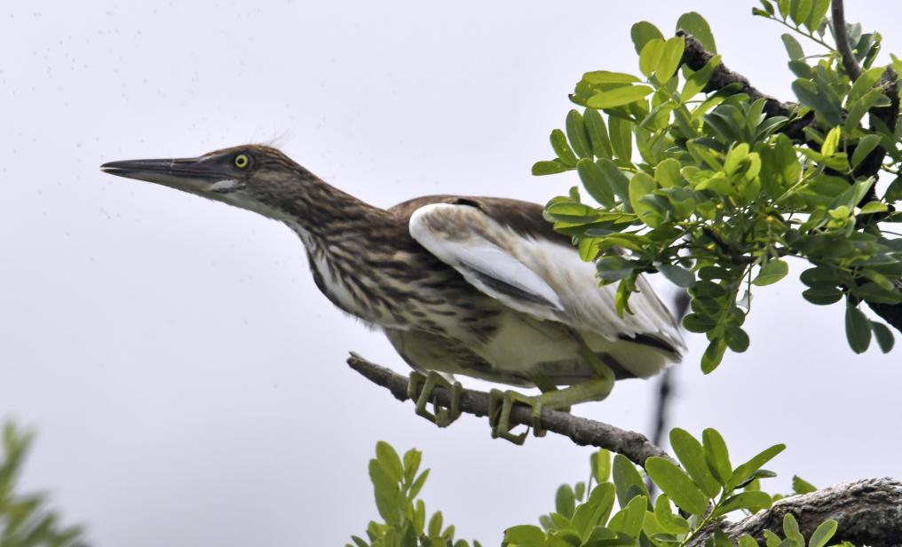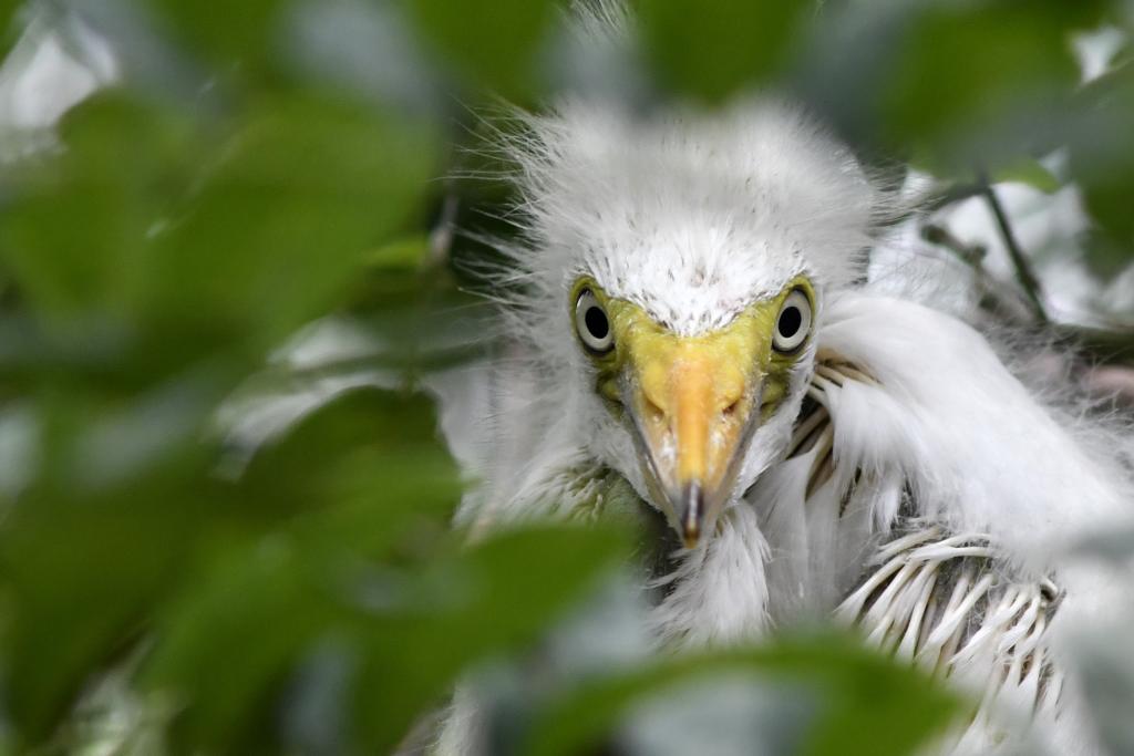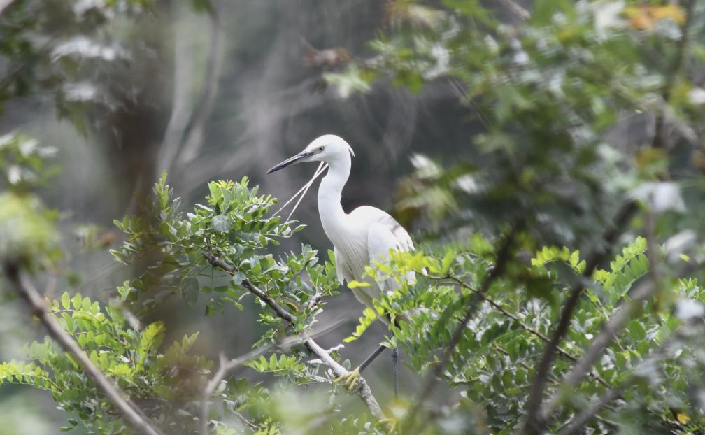 鸟岛上幼鸟们在鸟爸爸、鸟妈妈的带领下,正在努力练习。顺着小径往岛深处走,远远看到一只没有熟练掌握飞行技能的小苍鹭挂在树枝中,扑腾了几下便跌跌撞撞地掉在地面上,看到人类靠近,小家伙抖了抖羽毛就跑开了。赵铭靓说:“小苍鹭个头长起来了,身体也相对结实,所以即使掉下来也不用太担心,它自己努力几次就能扑腾上树枝,然后再学飞。”