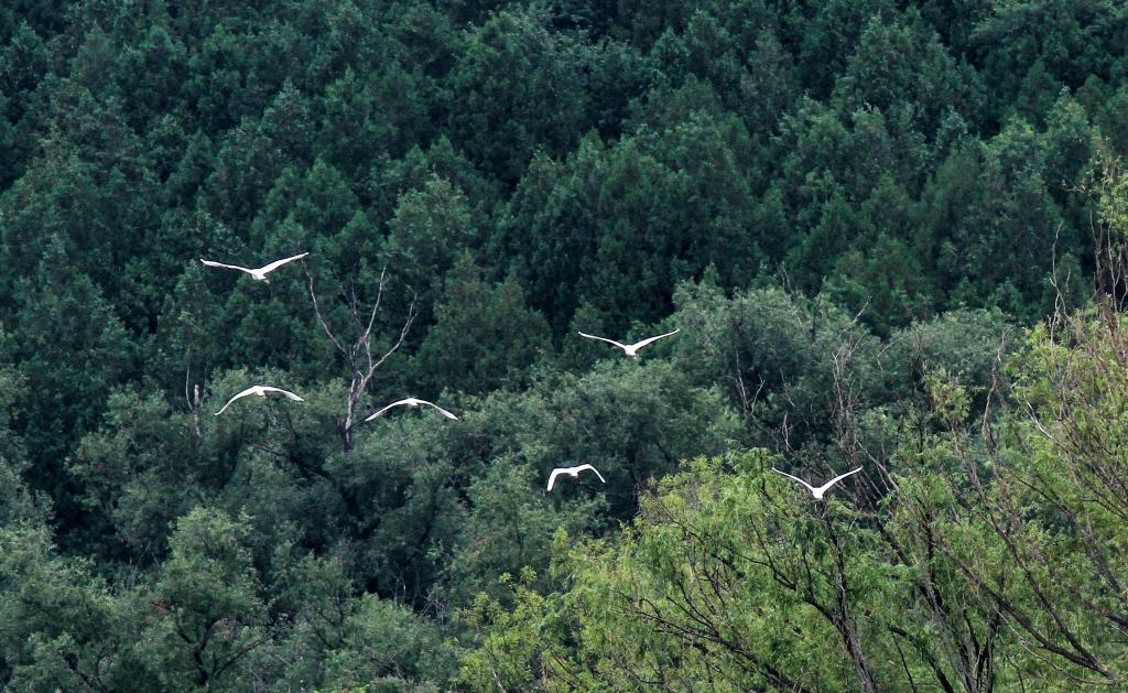 白鹭在鸟岛周边飞翔(7月8日摄)。