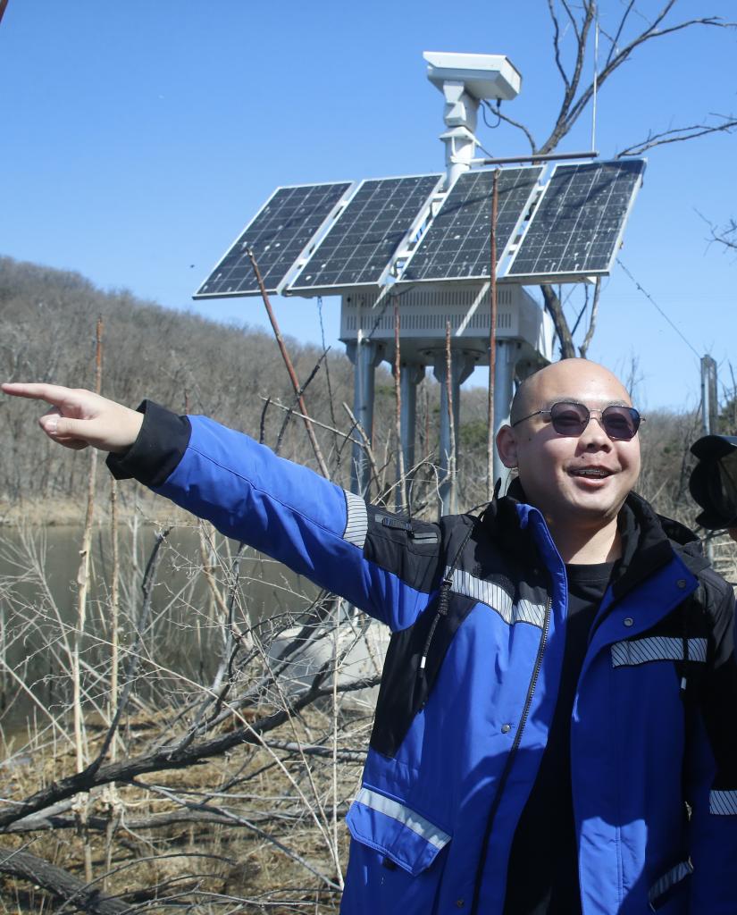 密云水库管理处水生态所内湖管理站管理员石子航在介绍鸟岛周边安装的鸟类监测设备(4月2日摄)。