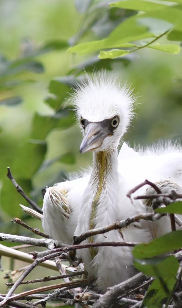 白鹭幼鸟在鸟岛上栖息(7月8日摄)。