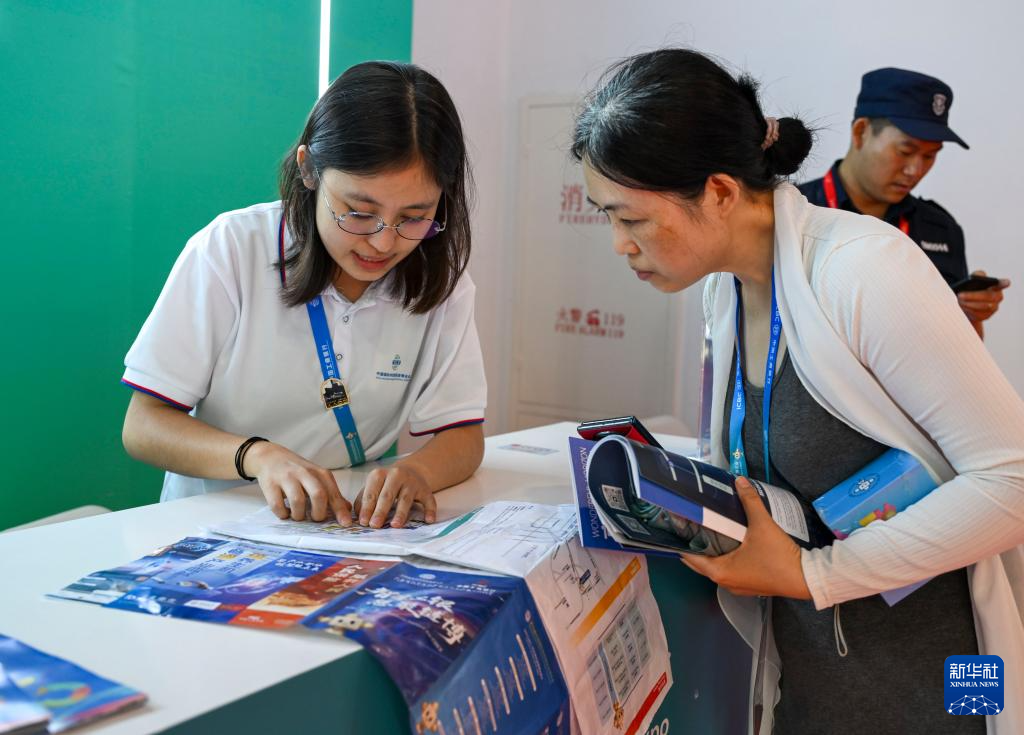 7月20日,来自北京外国语大学的志愿者(左)在第三届链博会引导台为观众提供服务。