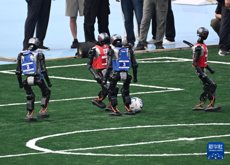 足球赛场上,来自北京加速进化科技有限公司的人形机器人搭载核心感知、运控、导航和决策算法,完成抢断、传球、射门等连贯动作。