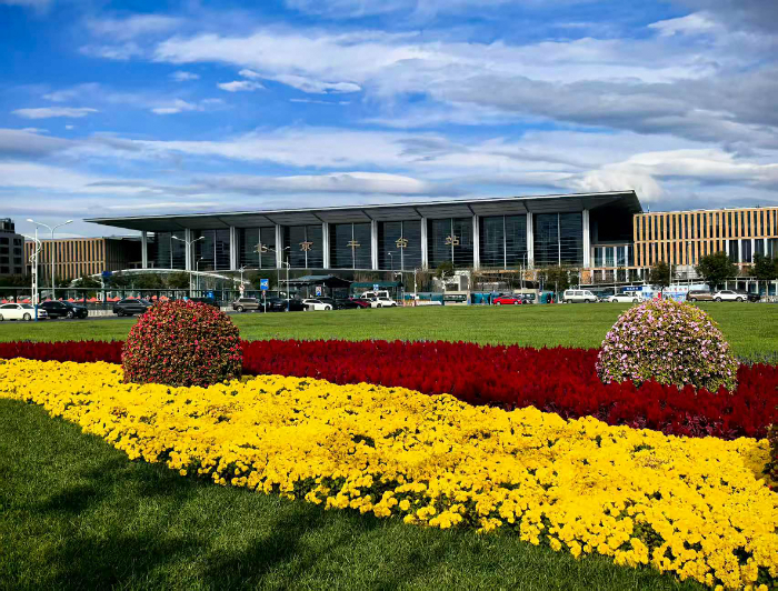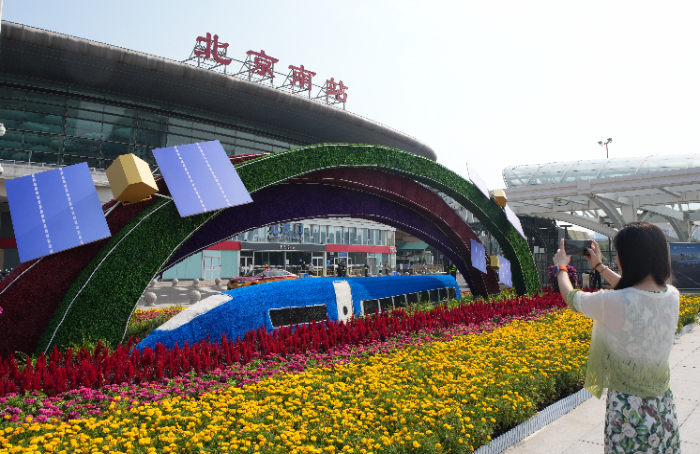 北京南站南广场花坛吸引游客打卡拍照
