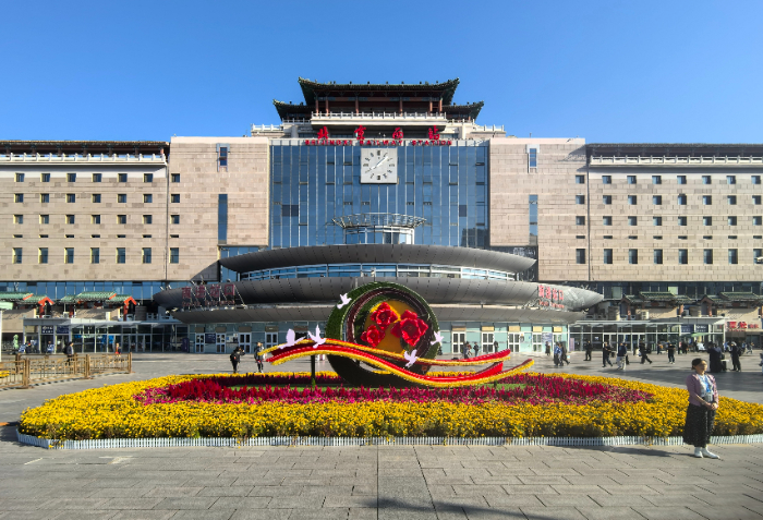 旅客在北京西站花坛前拍照留念