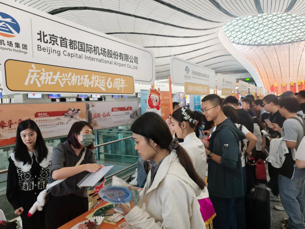 当天上午,机场举办了为期两天的“925主题嘉年华集市”活动,国内外航空公司、在线旅游平台(OTA)、国内外文旅局、友好机场等70余家单位共同参与,让旅客现场了解航空公司最新航线产品与优惠、各地特色旅游资源,参与趣味互动游戏赢取机票、航旅周边,还可欣赏舞蹈、京剧、乐器演奏等文艺节目,在候机间隙感受热烈氛围。北京大兴国际机场航空业务部业务经理李紫薇介绍:“我们还策划了‘小朋友的第一次飞行'、‘极速达'等六大创新活动,让不同旅客都能参与趣味互动,也体现机场交通便捷,服务暖心,航线通达的核心优势。”